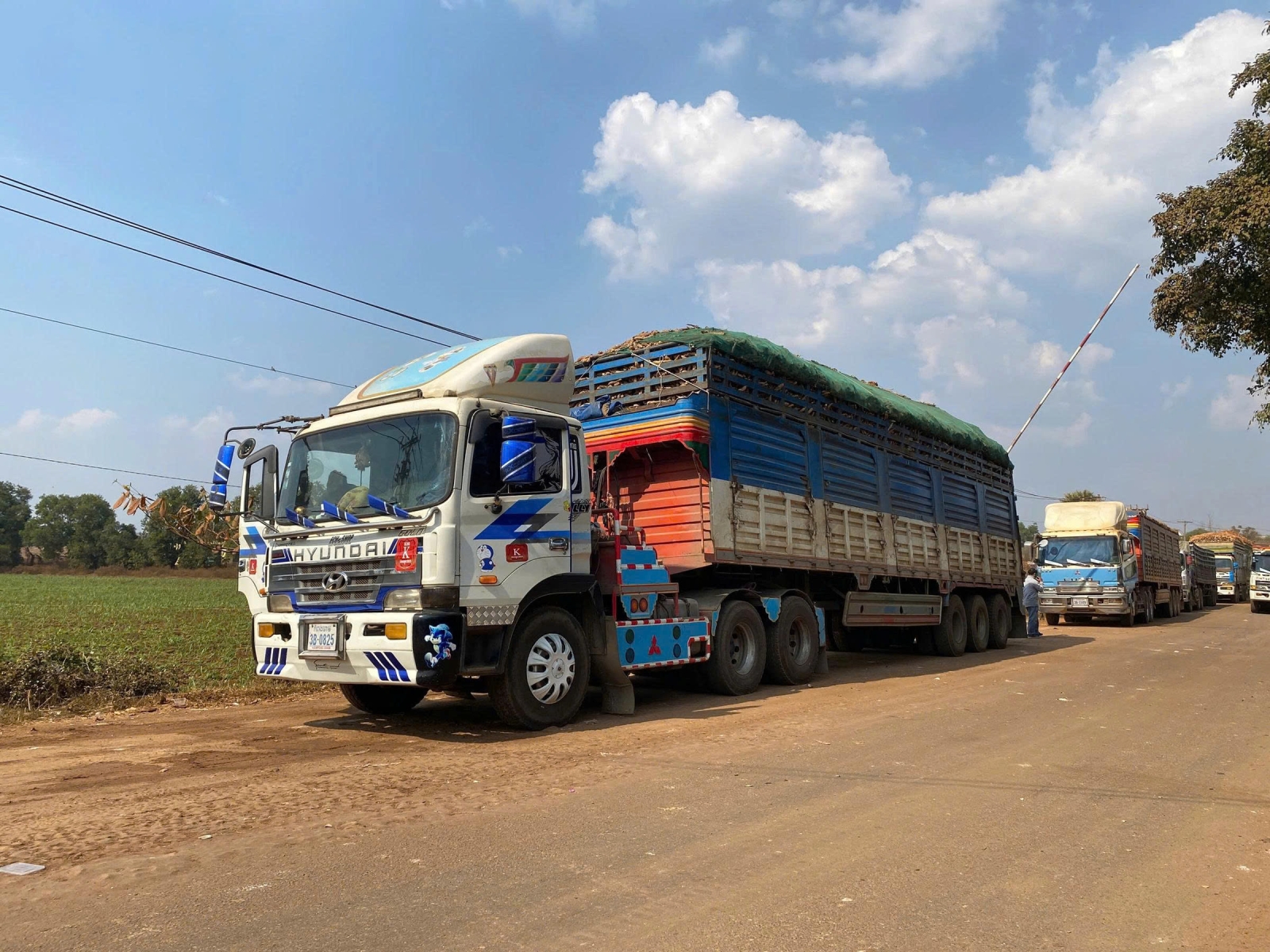 Xe tải chở khoai mì xếp hàng khu vực cửa khẩu Xa Mát chờ thông quan
